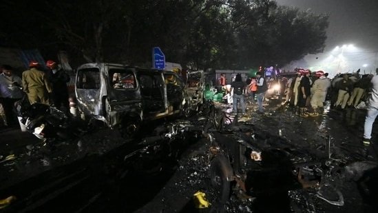 हुंडई i20 कार में धमाका। कार धीमी गति से चल रही थी और सिग्नल पर रुकी हुई थी। धमाके से कार के तीनों यात्री मारे गए, आसपास पैदल यात्री घायल। सड़क पर शव के टुकड़े बिखर गए।